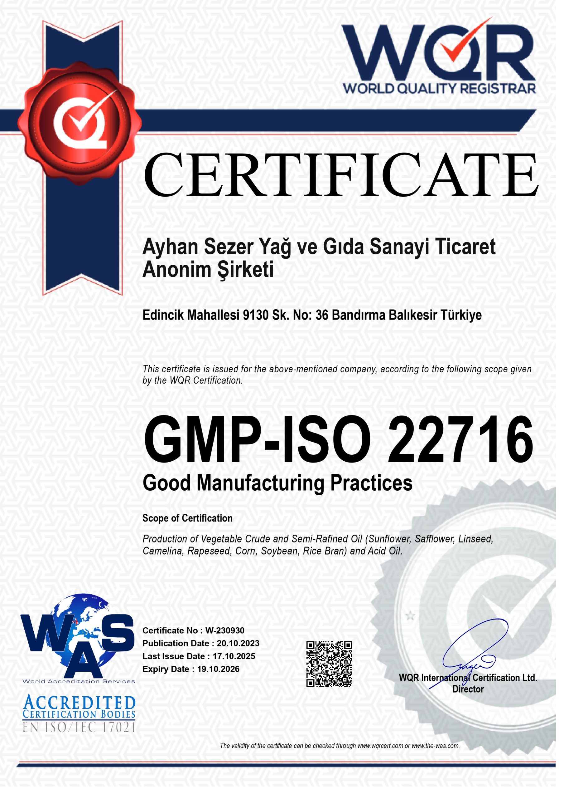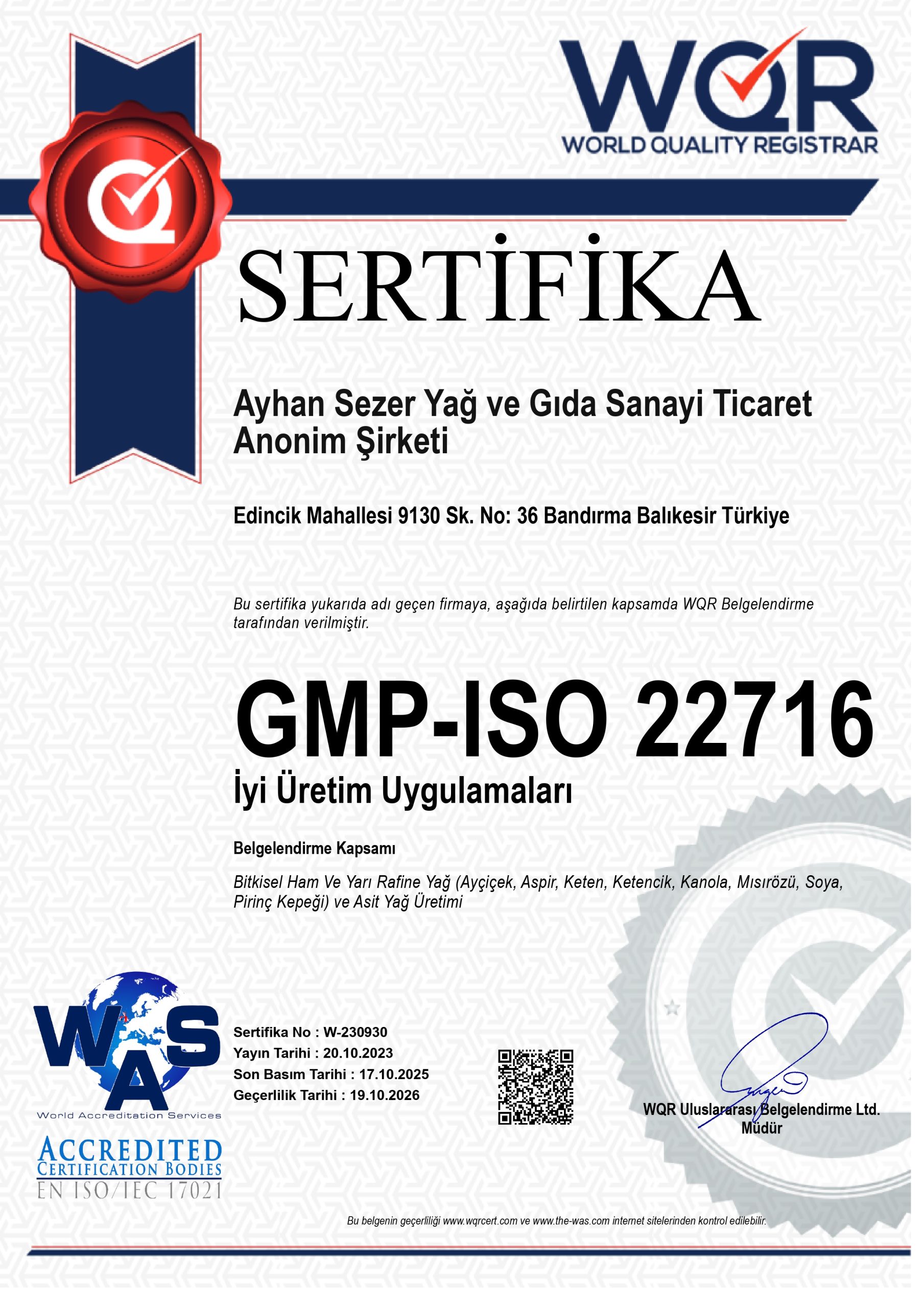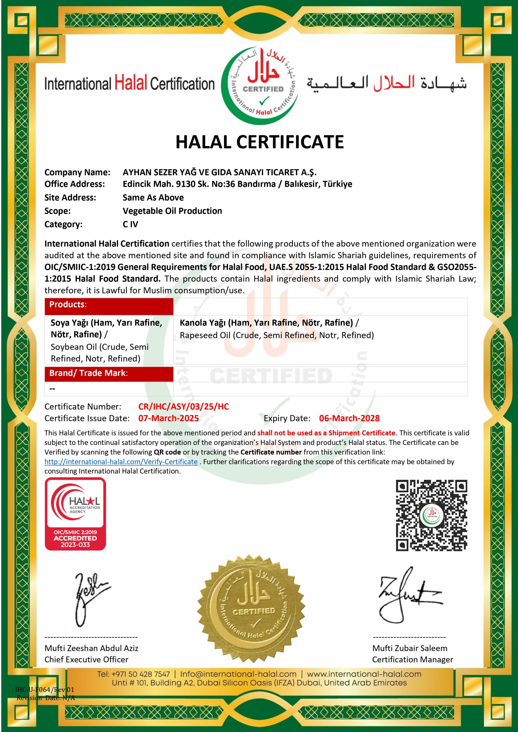 Sertifikalarımız Tesisimiz ve markamızın tüm sertifikalarına buradan ulaşabilirsiniz. Ulusal ve uluslararası düzeyde gereken standartları sağlamak adına Helal Gıda Güvenliği; çevre, iş güvenliği ve kalite esaslarına uygun tüm sertifikalara sahibiz.